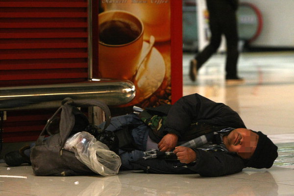 | 6일 새벽 대구시 중구 반월당 지하쇼핑 상가 바닥에서 한 노숙인이 추위 속에 잠을 청하고 있다. 뒤의 '따뜻한' 아메리카노 커피 광고가 묘한 대조를 이룬다. |