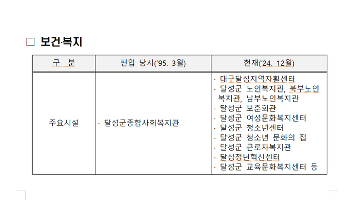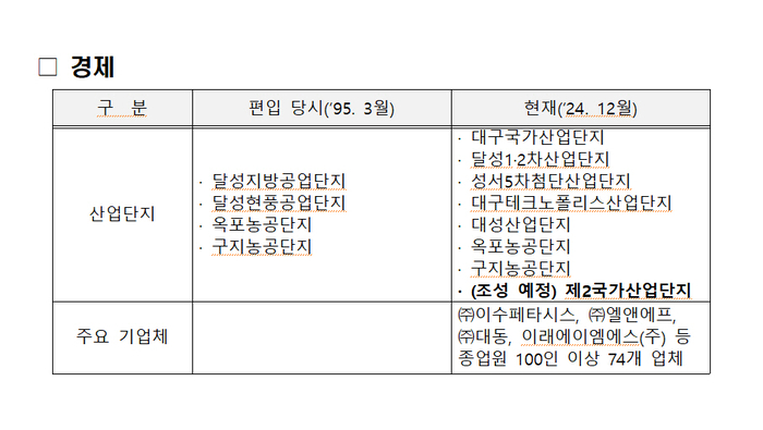달성군은 대구시 편입 당시 인구가 11만 3천명이었다. 현재는 26만 6천명으로 늘었다. 행정구역은 1읍 8면→6읍 3면으로 개편됐다. 예산 규모는 722억 → 9천568억원(2025년 본예산 기준)으로 10배 이상 확대됐다. 도시철도 1·2호선 개통과 산업단지 확충으로, 자족 도시의 위상도 갖췄다. 도시 개발 역시 활발히 진행됐다. 유가·현풍읍 대구테크노폴리스(유가·현풍읍)는 연구개발 특구로 지정돼 2006년부터 주거·상업·교육·문화가 조화된 계획도시로 발전했다. 이곳엔 대구경북과학기술원(DGIST), 한국전자통신연구원 대경권연구본부, HD현대로보틱스 등이 둥지를 틀었다.