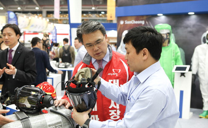 | 이재만 새누리당 대구시장 예비후보는 9일 엑스코에서 열린 대한민국 국제소방안전박람회를 찾아 “재난재해 제로(Zero)도시 대구를 만들겠다”고 약속했다. <이재만 예비후보 제공> |