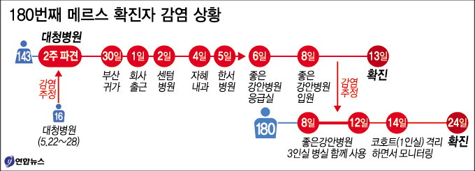 보건복지부 중앙메르스관리대책본부는 25일 현재 메르스 확진자가 전날보다 1명 증가한 180명이라고 밝혔다. 신규 확진자인 180번 환자(55)는 지난 8일부터 12일까지 부산 좋은강안병원에서 143번 환자(31)와 같은 병실에 입원했던 사람이다.