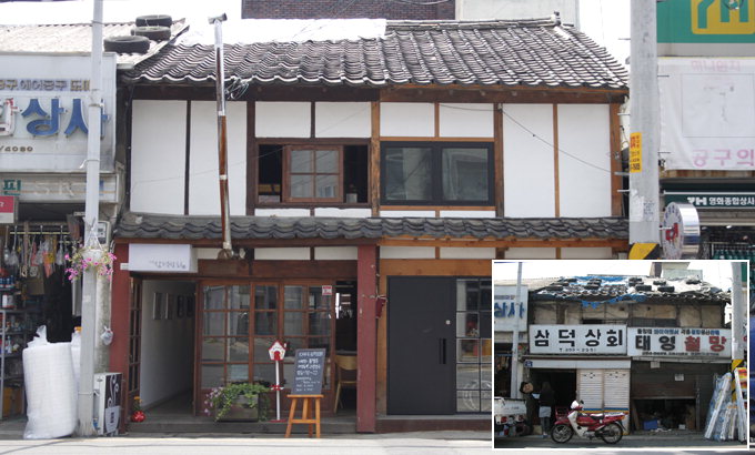 | 1930년대에 지어진 일본식 가옥 형태를 지닌 철물점 삼덕상회의 리노베이션 후 모습. 건물 왼쪽이 ‘카페 삼덕상회’, 오른쪽이 건축사무소인 ‘아키텍톤’이다. 작은 사진은 리노베이션 전 모습. <시간과공간연구소 제공> |