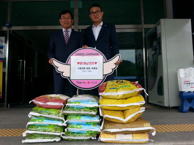 LED 전문 조명 제조업체인 <주>테크엔 이영섭 대표이사(왼쪽)가 최근 대구국가산업단지 첫 공장 착공식 때 화환을 대신해 기증받은 쌀 200㎏을 최근 대구시 달성군 다사읍사무소를 방문해 달성복지재단에 기탁했다.