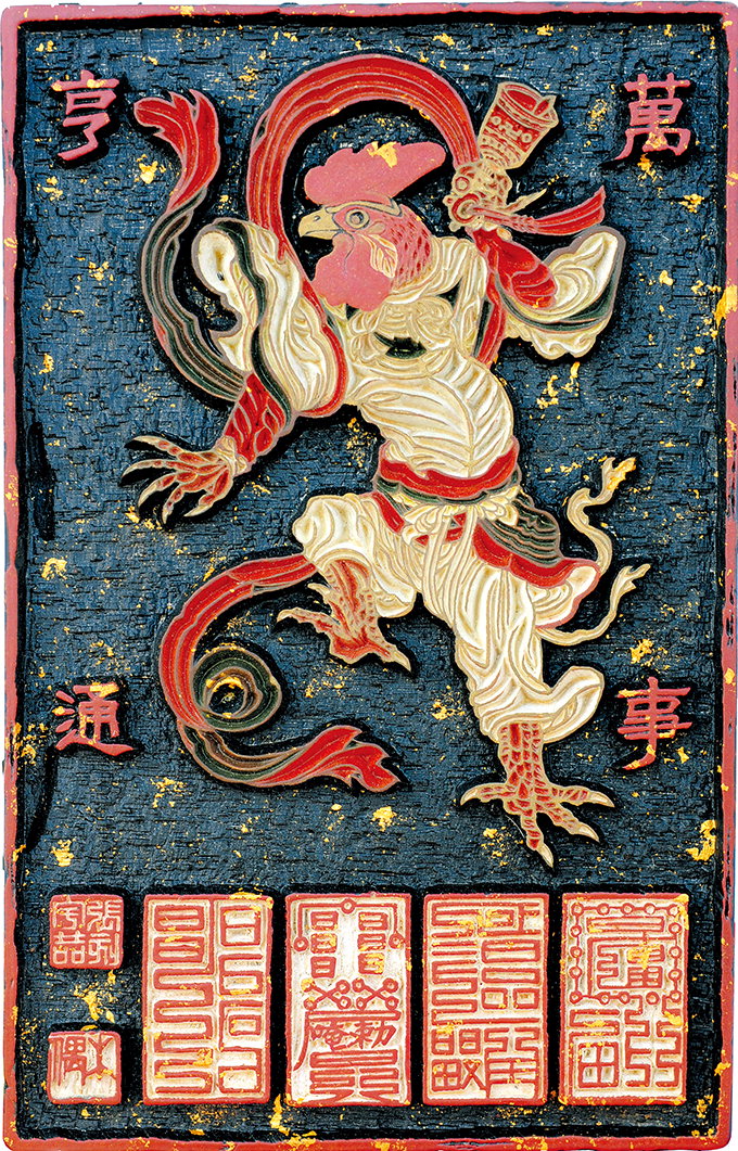 | 국가무형문화재 각자장 이수자인 장승천씨의 작품 ‘만사형통’. 아래쪽에 소원성취, 관액방지, 가택평안, 견군밀호(오른쪽부터)의 부적이 새겨져 있다. |