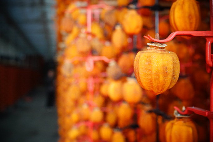 | 상주는 전국 유통량의 60% 이상을 차지할 정도의 곶감 특구다. 10월 초중순에 수확된 둥시는 50~60일 빛가림시설이 잘된 대형창고형 덕장에 걸린다. 예전에는 싸리나무 꼬챙이로 꿰거나 실에 걸어 말렸는데 이제는 플라스틱 행거를 이용해 곶감을 건다. |
