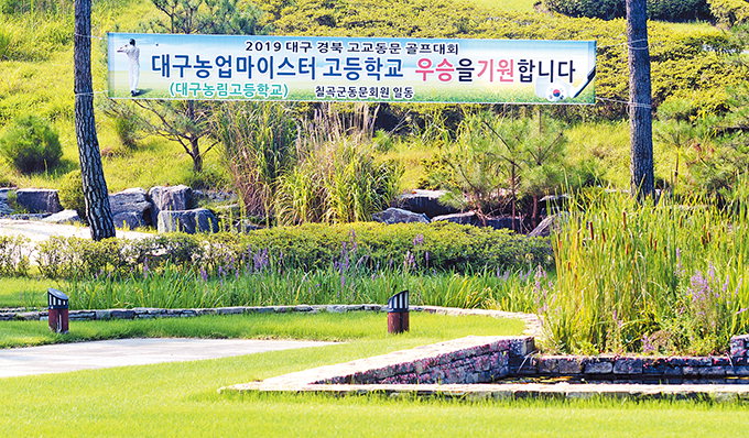 | 세븐밸리CC에 ‘2019 대구경북 고교동문 골프대회’에 참가하는 대구농업마이스터고 선수들의 우승을 기원하는 플래카드가 걸려 있다. |