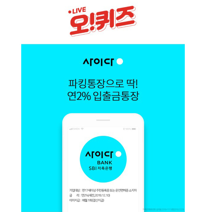 오늘(24일) OK캐쉬백의 오퀴즈 이벤트 오전 11시에는 "장기간 묶어두기 어려운 비상금 등 여유자금은 ○○○○보다 조건없이 연 2.0% 금리를 받을 수 있는 사이다뱅크 입출금통장으로 활요해 보세요."라는 퀴즈가 등장했다. 해당 문제의 정답은 '금액제한없이'이다.