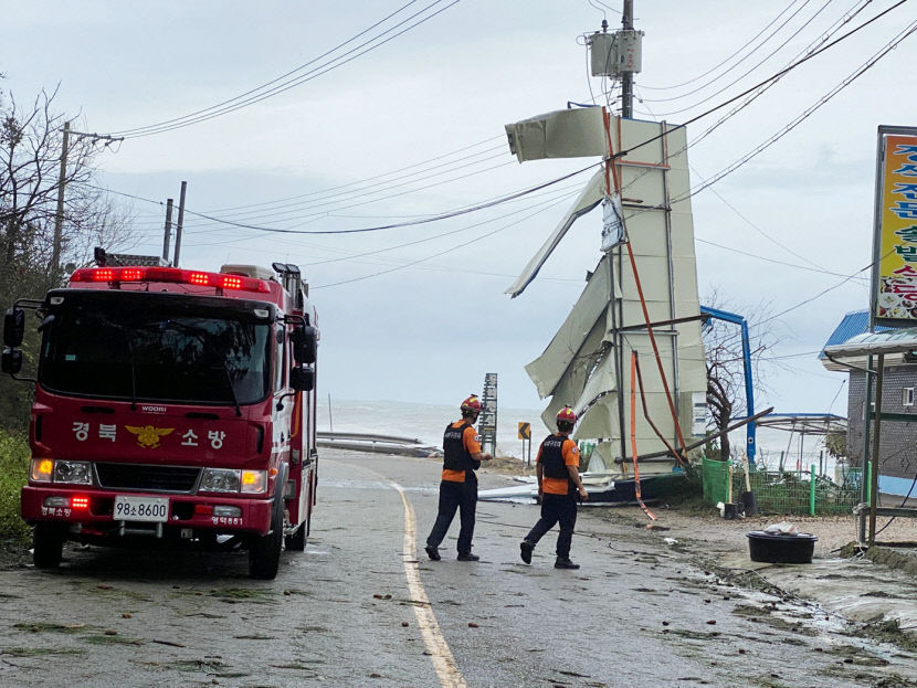 또 영덕읍 한 빌라 현관의 통유리 출입문이 강풍에 떨어져 나갔고 강구면 해안가의 공사장 대형 패널이 도로 옆 전신주를 덮치기도 했다.