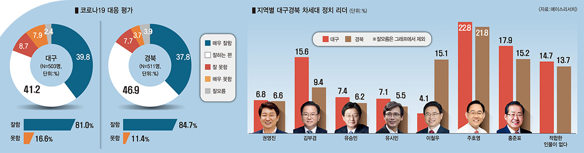 대구지역의 경우 잘 하고 있다는 응답이 81.0%(매우 잘 함 39.8%, 잘하는 편 41.2%)로 높은 반면 못 한다(잘 못함 8.7%, 매우 못함 2.4%)는 16.6%로 낮았다. 긍정 평가는 10명 중 8명꼴, 부정 평가는 10명 중 12명꼴이었다.