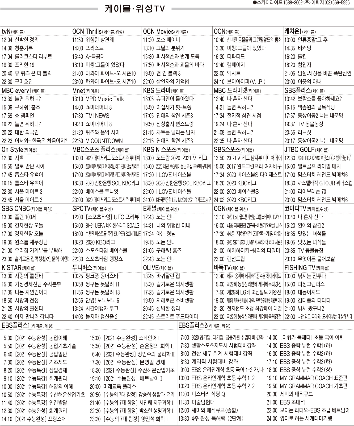 10월14일 케이블·위성TV 편성표