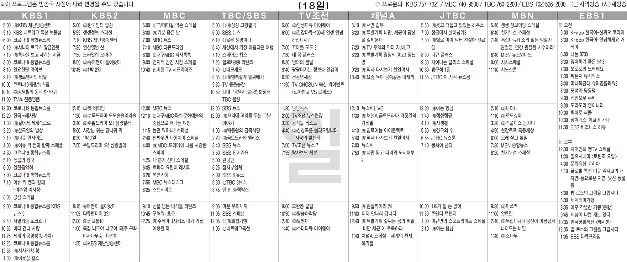 10월18일 TV 편성표