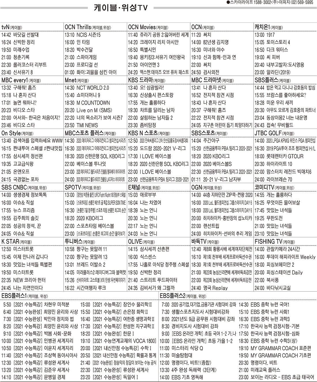 10월20일 케이블·위성TV 편성표