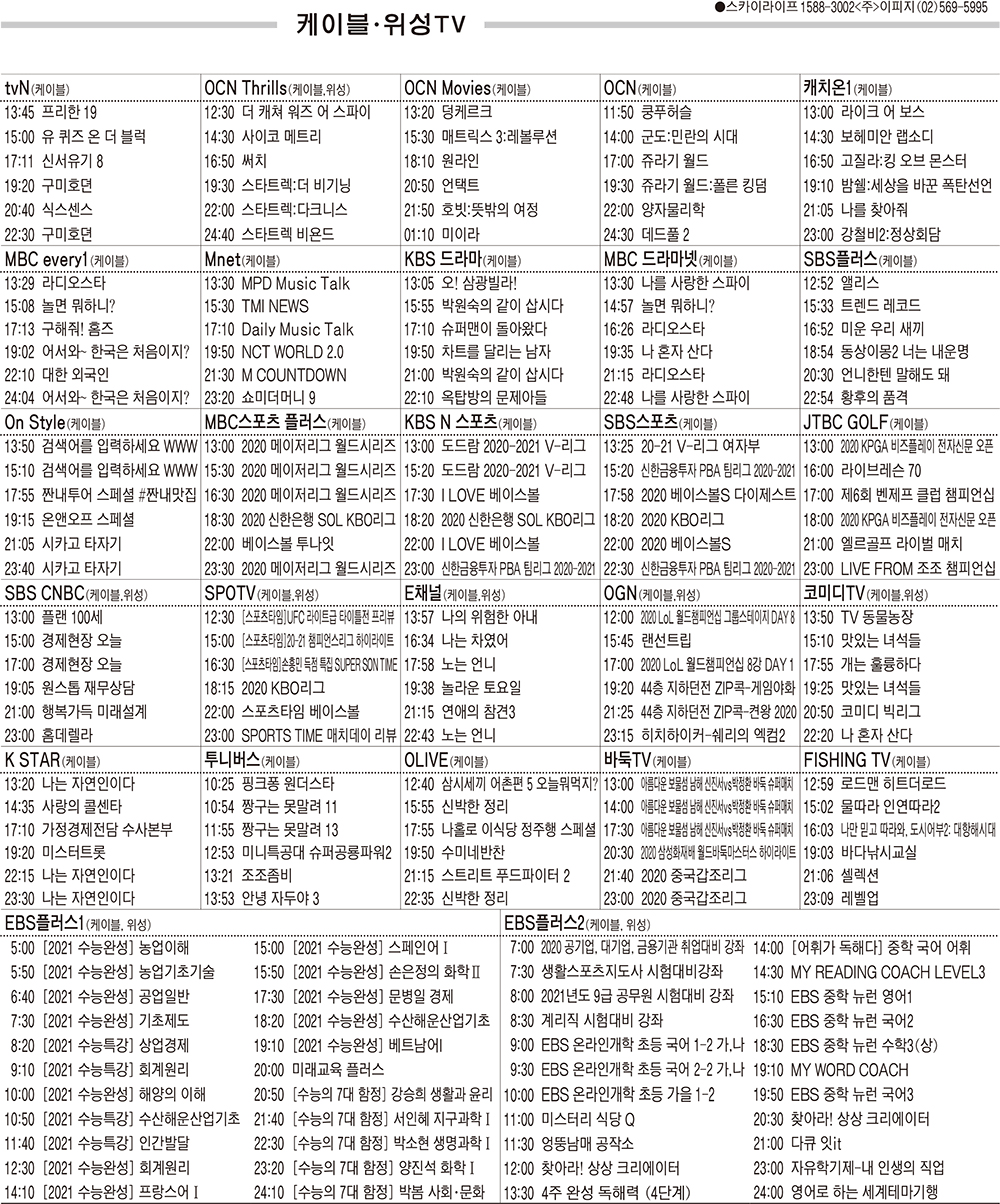 10월22일 케이블·위성TV 편성표
