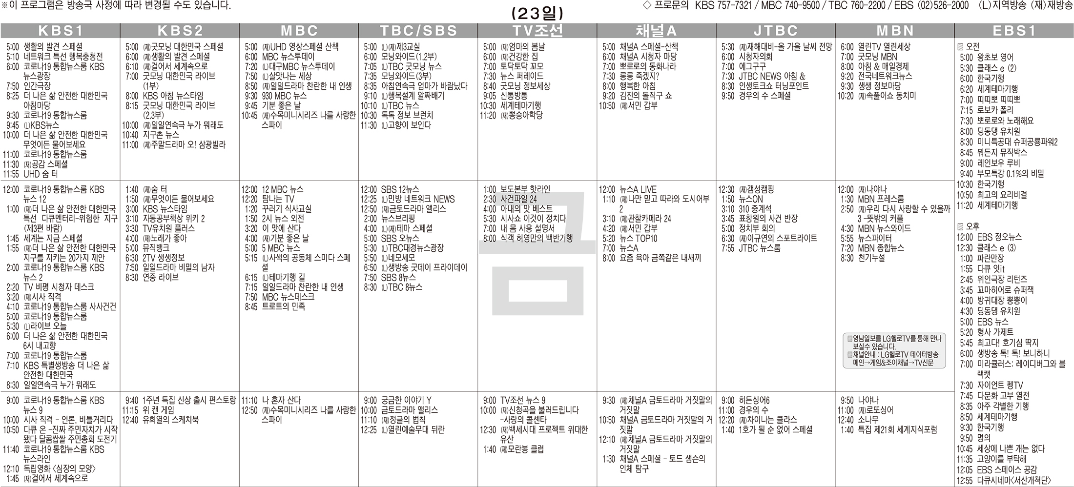 10월23일 TV 편성표