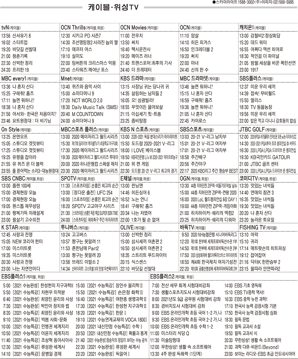 10월26일 케이블·위성TV 편성표