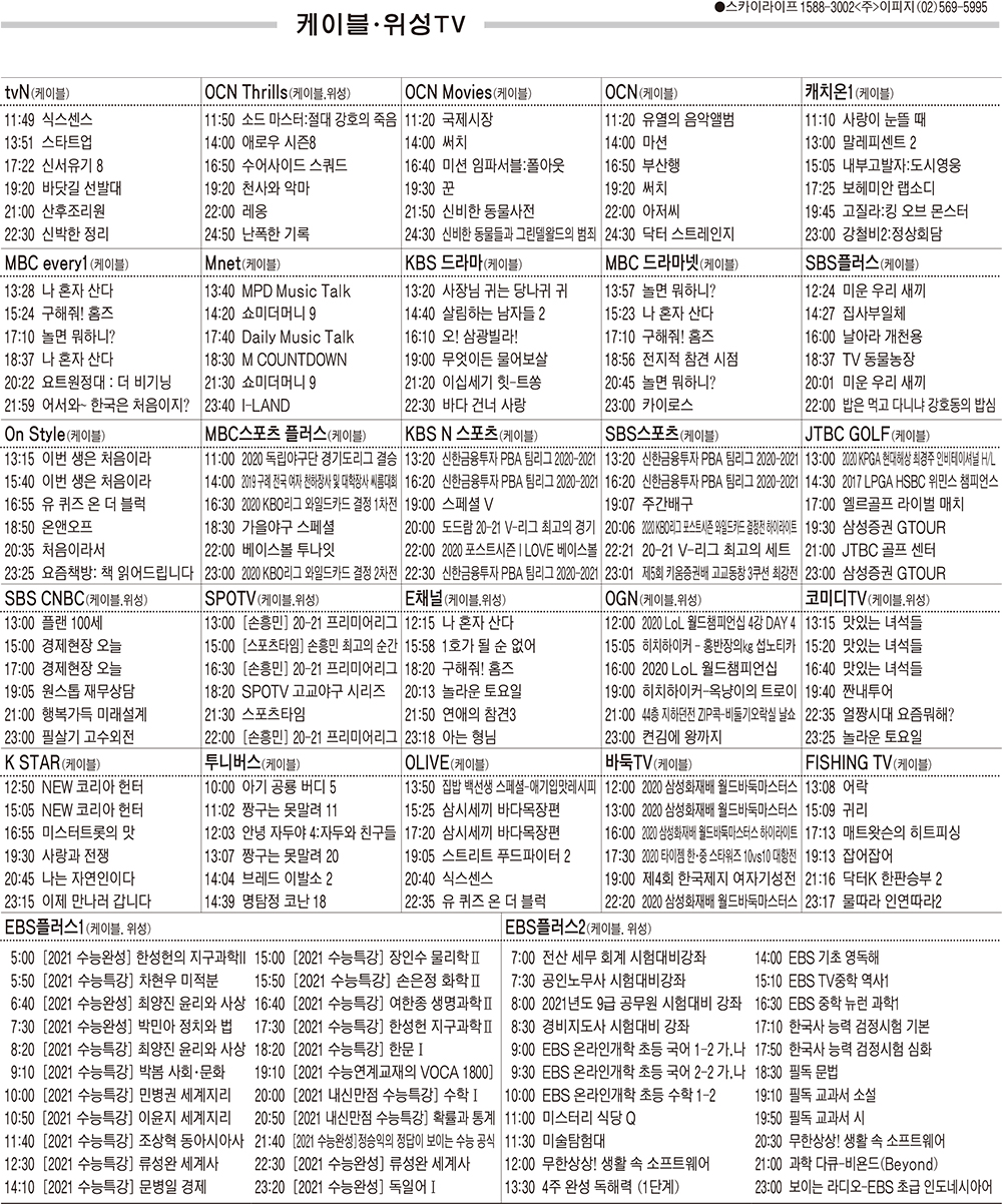 11월2일 케이블·위성TV 편성표