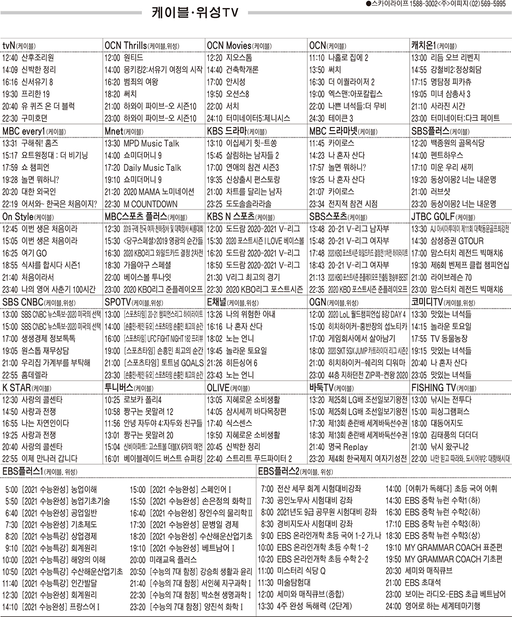 11월4일 케이블·위성TV 편성표