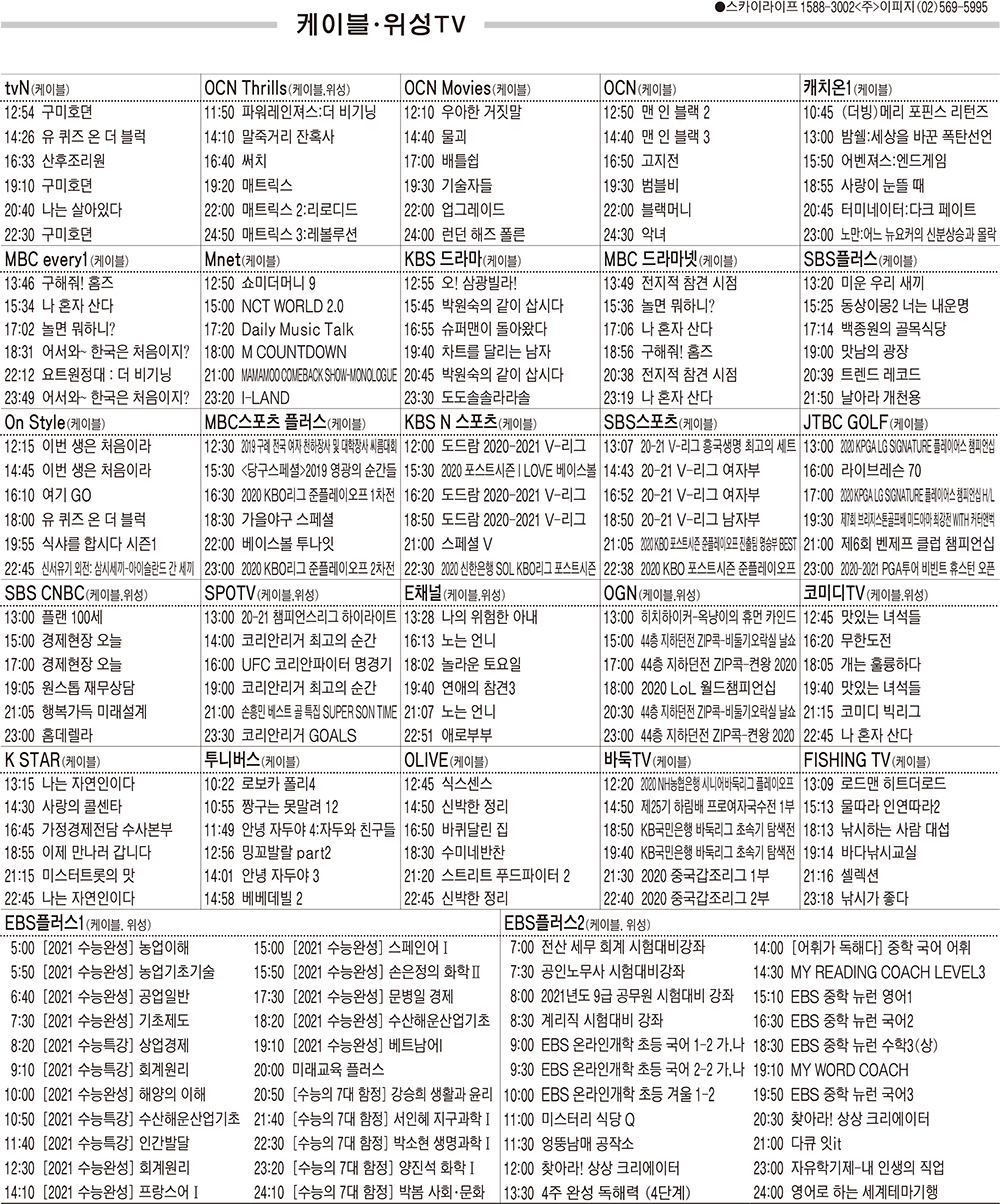 11월5일 케이블·위성TV 편성표
