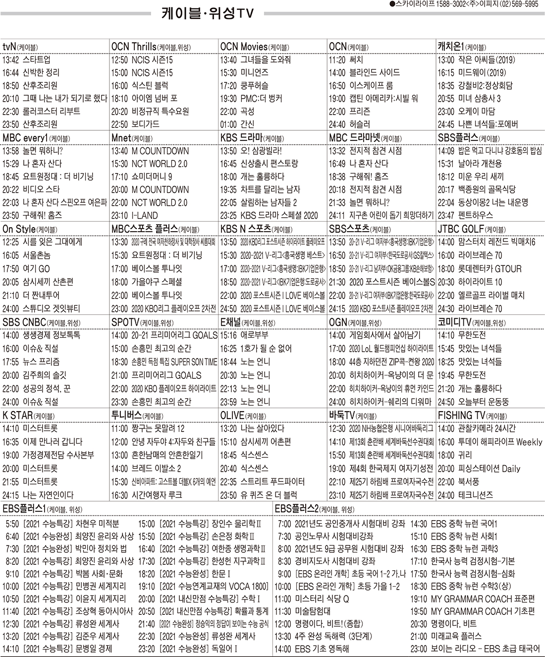 11월10일 케이블·위성TV 편성표