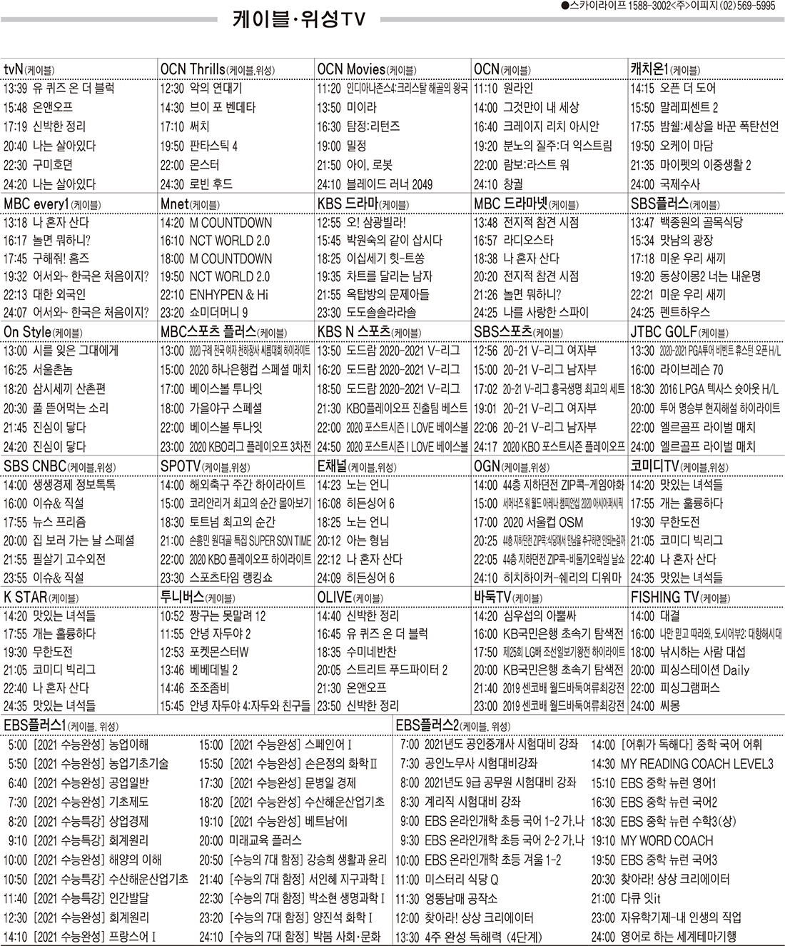 11월12일 케이블·위성TV 편성표