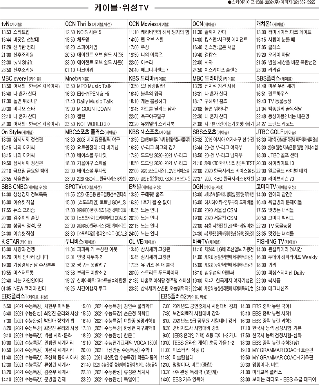 카카오톡 페이스북 트위터 전체 네이버밴드 네이버블로그 11월24일 케이블·위성TV 편성표 박성희 기사 전체보기 영남일보(www.yeongnam.com), 무단전재 및 수집, 재배포금지 연예인기뉴스