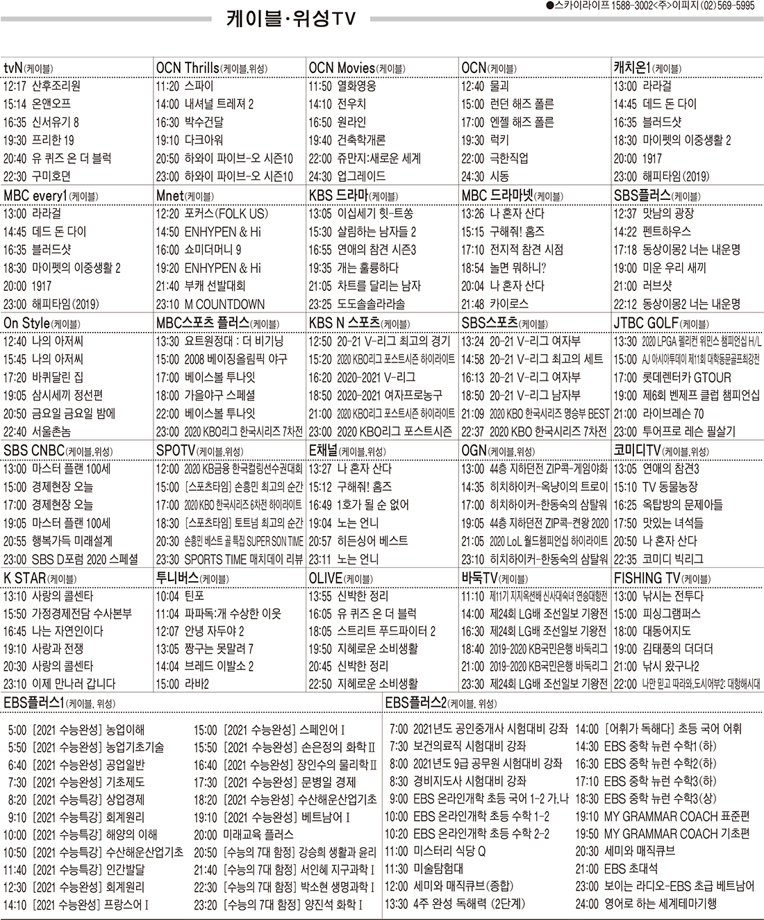 카카오톡 페이스북 트위터 전체 네이버밴드 네이버블로그 11월25일 케이블·위성TV 편성표 박성희 기사 전체보기 영남일보(www.yeongnam.com), 무단전재 및 수집, 재배포금지 연예인기뉴스