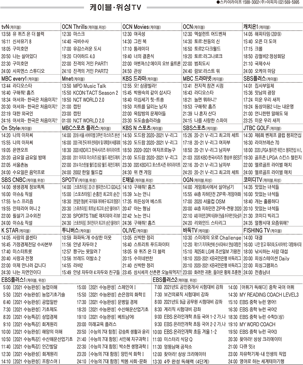 카카오톡 페이스북 트위터 전체 네이버밴드 네이버블로그 11월26일(목) 케이블·위성TV 편성표 박성희 기사 전체보기 영남일보(www.yeongnam.com), 무단전재 및 수집, 재배포금지 연예인기뉴스