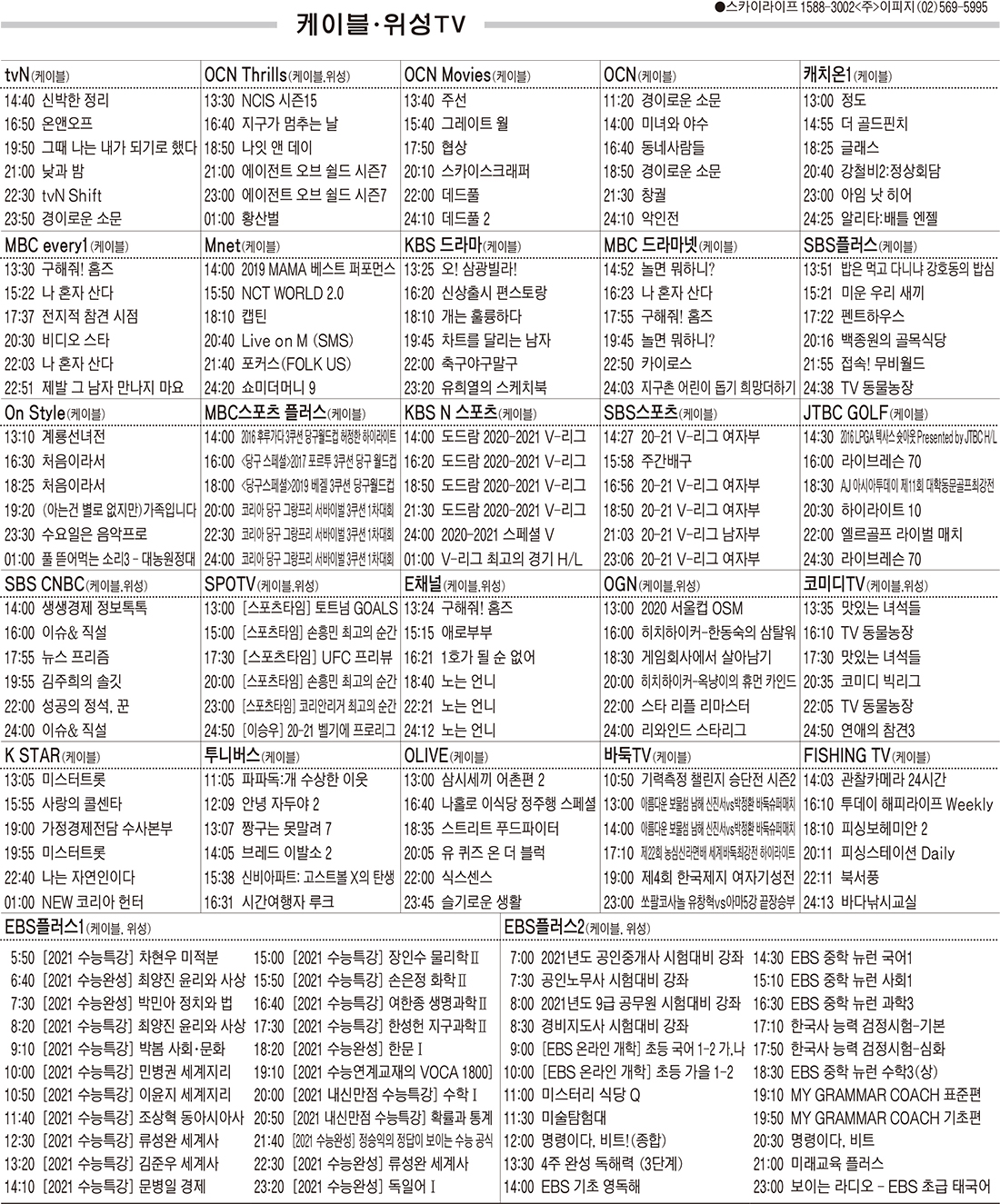 카카오톡 페이스북 트위터 전체 네이버밴드 네이버블로그 12월1일(화) 케이블·위성TV 편성표 박성희 기사 전체보기 영남일보(www.yeongnam.com), 무단전재 및 수집, 재배포금지 연예인기뉴스