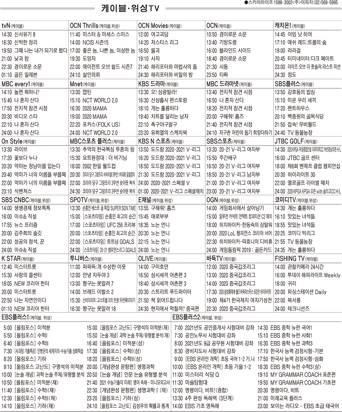 카카오톡 페이스북 트위터 전체 네이버밴드 네이버블로그 12월8일(화) 케이블·위성TV 편성표 박성희 기사 전체보기 영남일보(www.yeongnam.com), 무단전재 및 수집, 재배포금지 연예인기뉴스