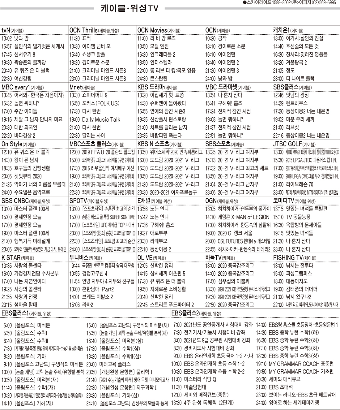 카카오톡 페이스북 트위터 전체 네이버밴드 네이버블로그 12월16일(수) 케이블·위성TV 편성표 박성희 기사 전체보기 영남일보(www.yeongnam.com), 무단전재 및 수집, 재배포금지 연예인기뉴스