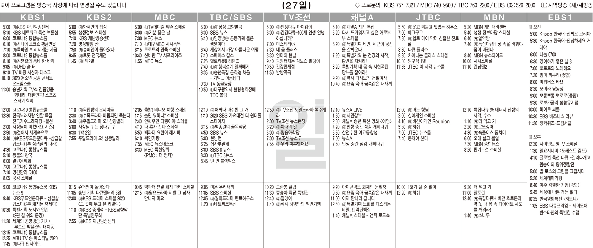 카카오톡 페이스북 트위터 전체 네이버밴드 네이버블로그 12월27일(일) TV 편성표 박성희 기사 전체보기 영남일보(www.yeongnam.com), 무단전재 및 수집, 재배포금지 연예인기뉴스