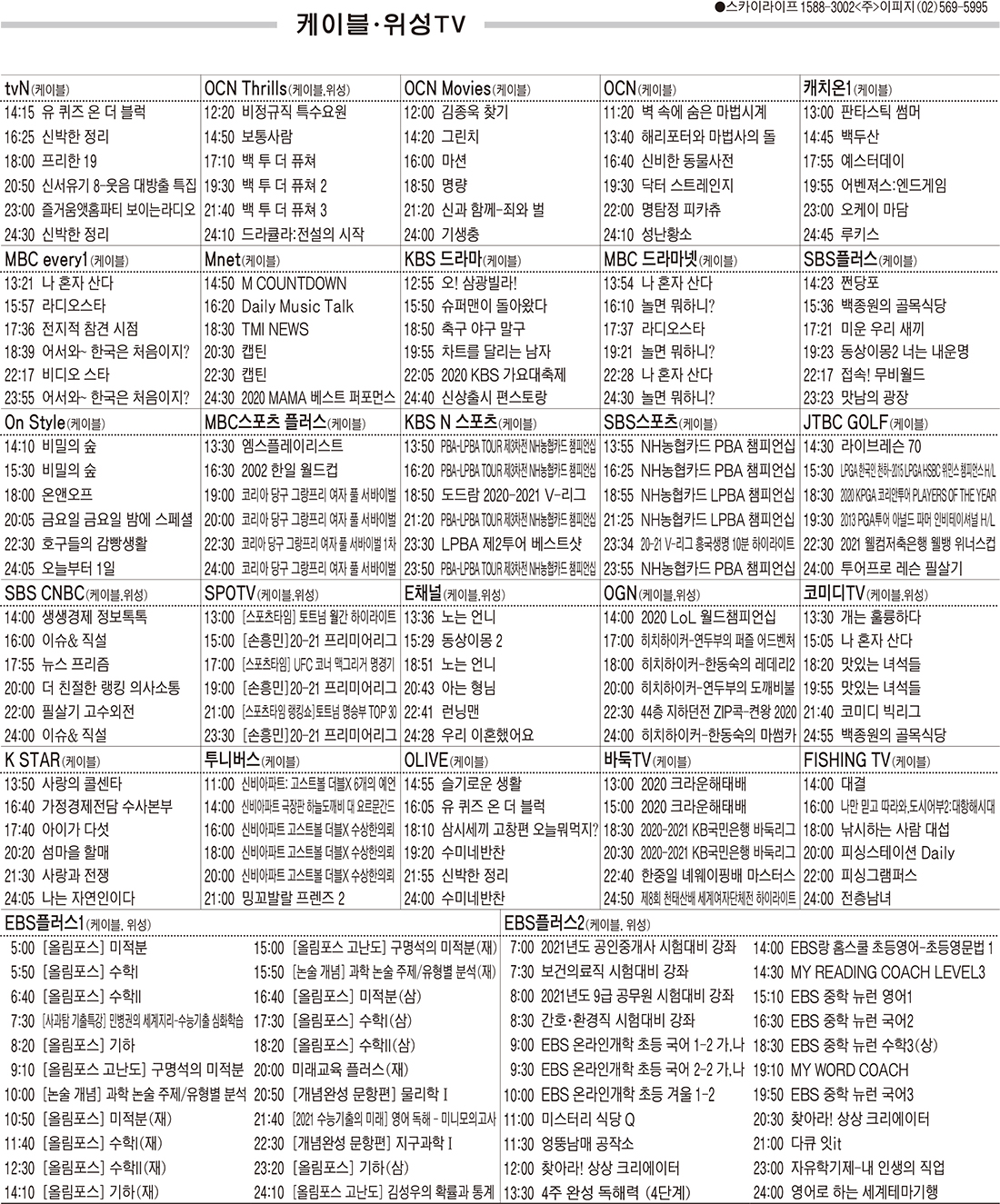 카카오톡 페이스북 트위터 전체 네이버밴드 네이버블로그 12월31일(목) 케이블·위성TV 편성표 박성희 기사 전체보기 영남일보(www.yeongnam.com), 무단전재 및 수집, 재배포금지 연예인기뉴스