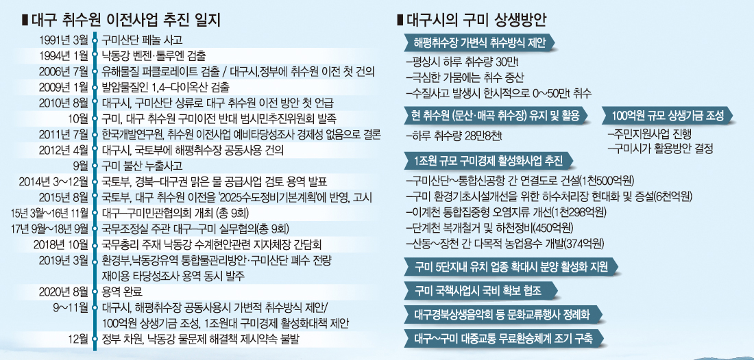대구 취수원(문산·매곡 취수장) 구미산단 상류 이전 논의는 2010년 대구시가 처음 점화했다. 1991년 페놀사고 이후 벤젠·톨루엔(1994년), 퍼클로레이트(2006년), 1.4-다이옥산 (2009년)이 잇따라 검출된 여파다. 10년의 세월이 흘렀지만, 상황이 급호전되기는 힘들다.