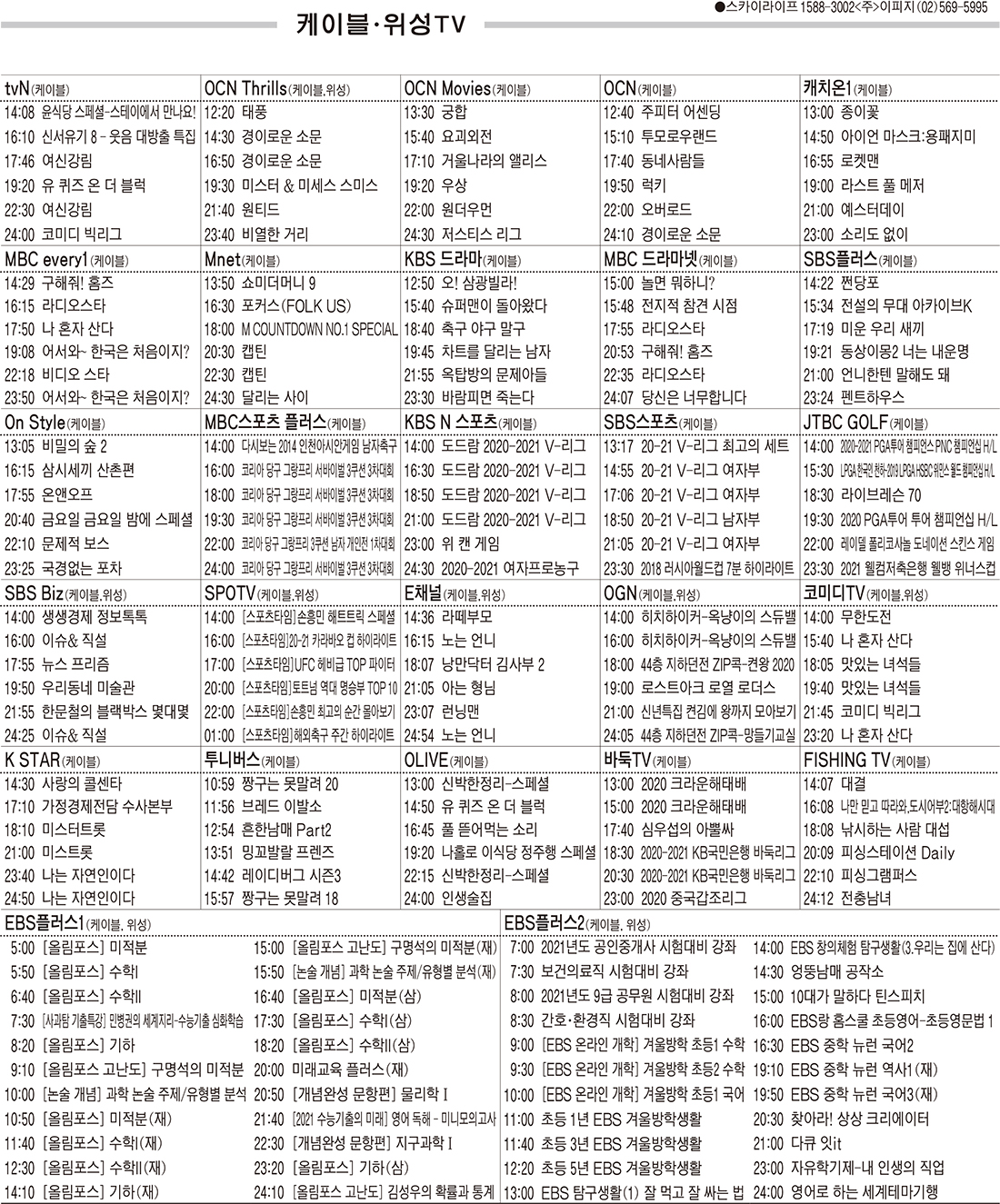 카카오톡 페이스북 트위터 전체 네이버밴드 네이버블로그 1월7일(목) 케이블·위성TV 편성표 박성희 기사 전체보기 영남일보(www.yeongnam.com), 무단전재 및 수집, 재배포금지 연예인기뉴스