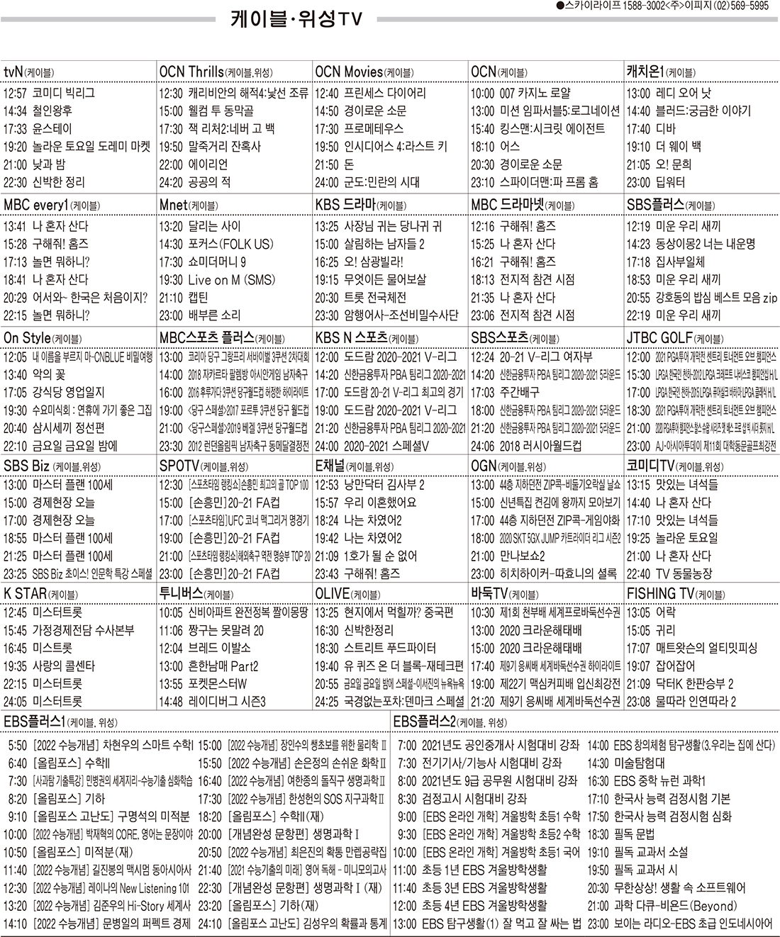 카카오톡 페이스북 트위터 전체 네이버밴드 네이버블로그 1월11일(월) 케이블·위성TV 편성표 박성희 기사 전체보기 영남일보(www.yeongnam.com), 무단전재 및 수집, 재배포금지 연예인기뉴스