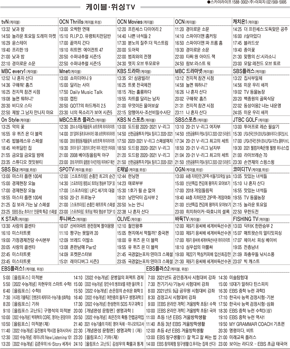 카카오톡 페이스북 트위터 전체 네이버밴드 네이버블로그 1월12일(화) 케이블·위성TV 편성표 박성희 기사 전체보기 영남일보(www.yeongnam.com), 무단전재 및 수집, 재배포금지 연예인기뉴스