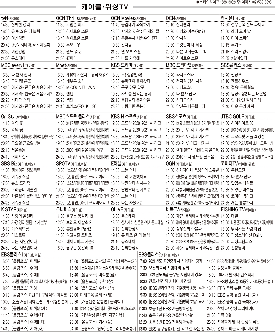 카카오톡 페이스북 트위터 전체 네이버밴드 네이버블로그 1월14일(목) 케이블·위성TV 편성표 박성희 기사 전체보기 영남일보(www.yeongnam.com), 무단전재 및 수집, 재배포금지 연예인기뉴스