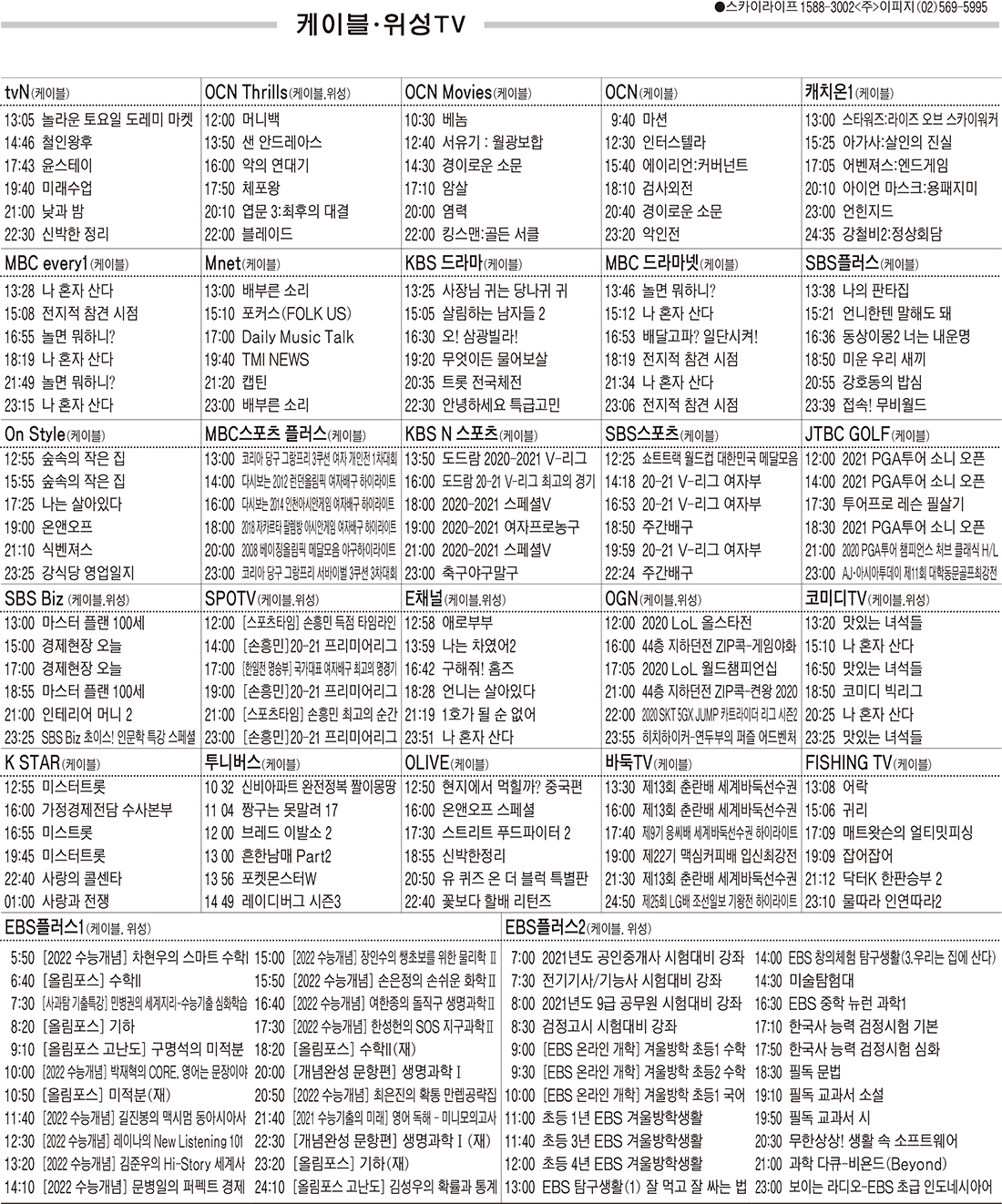 카카오톡 페이스북 트위터 전체 네이버밴드 네이버블로그 1월18일(월) 케이블·위성TV 편성표 박성희 기사 전체보기 영남일보(www.yeongnam.com), 무단전재 및 수집, 재배포금지 연예인기뉴스