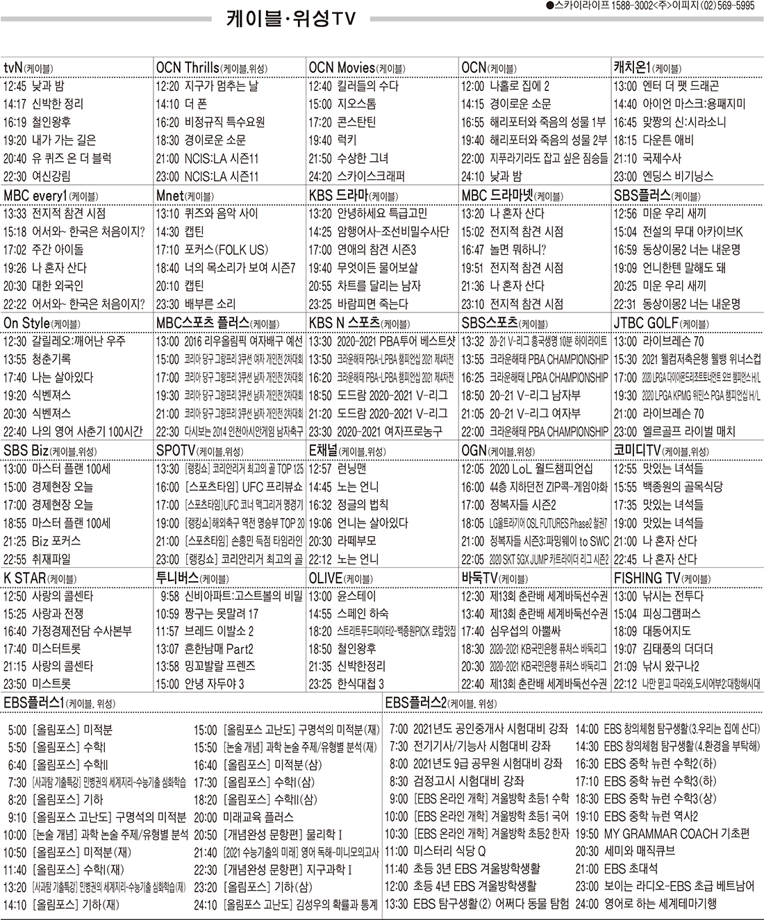 카카오톡 페이스북 트위터 전체 네이버밴드 네이버블로그 1월20일(수) 케이블·위성TV 편성표 박성희 기사 전체보기 영남일보(www.yeongnam.com), 무단전재 및 수집, 재배포금지 연예인기뉴스