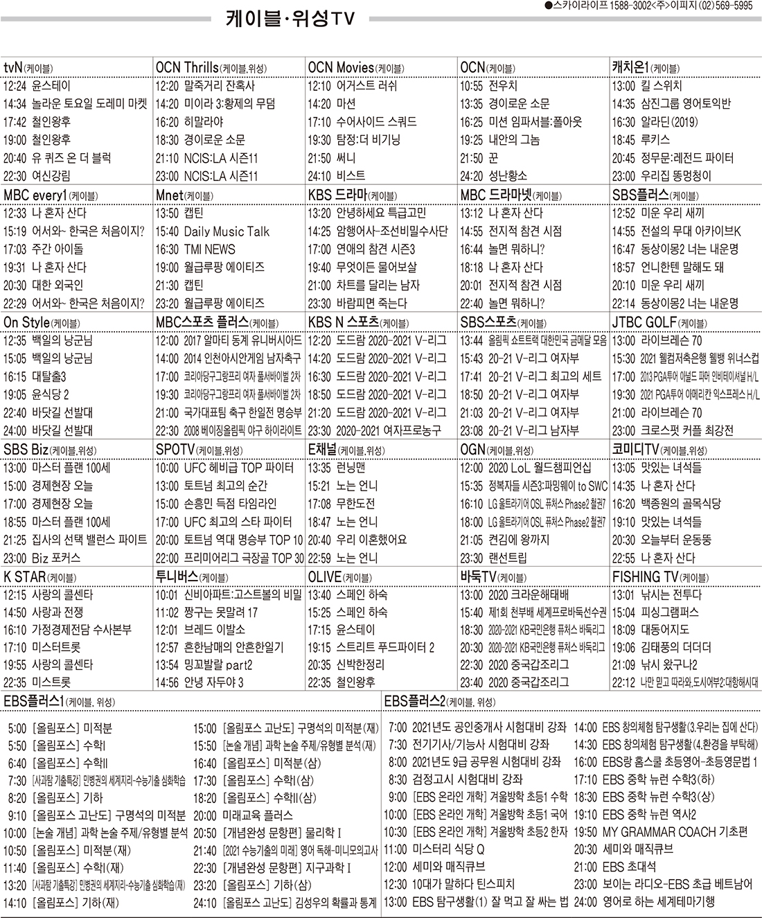 카카오톡 페이스북 트위터 전체 네이버밴드 네이버블로그 1월27일(수) 케이블·위성TV 편성표 박성희 기사 전체보기 영남일보(www.yeongnam.com), 무단전재 및 수집, 재배포금지 연예인기뉴스