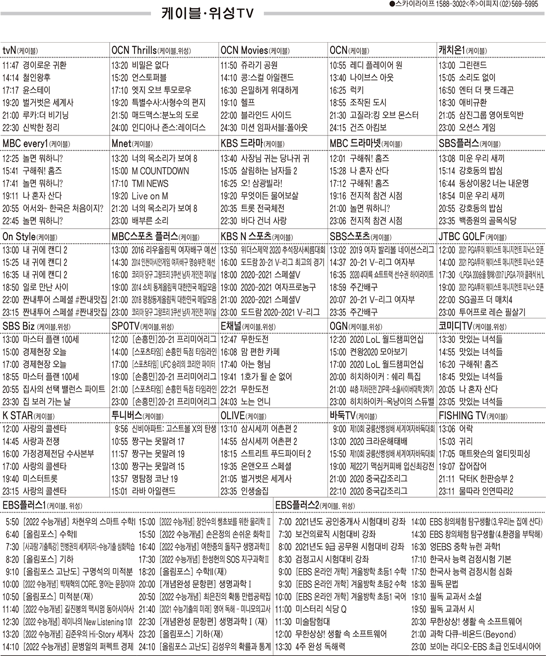 카카오톡 페이스북 트위터 전체 네이버밴드 네이버블로그 2월8일(월) 케이블·위성TV 편성표 박성희 기사 전체보기 영남일보(www.yeongnam.com), 무단전재 및 수집, 재배포금지 연예인기뉴스