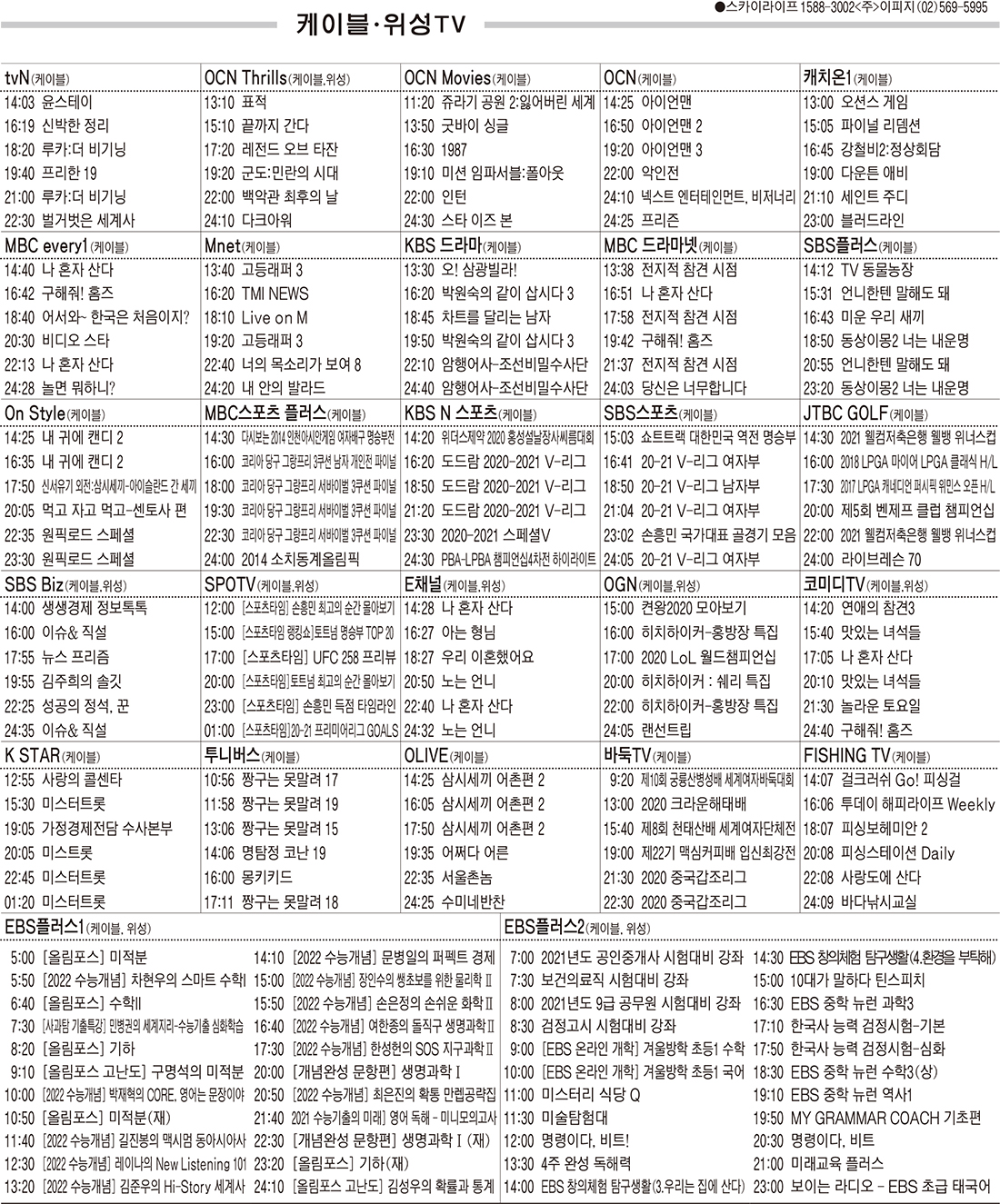 카카오톡 페이스북 트위터 전체 네이버밴드 네이버블로그 2월9일(화) 케이블·위성TV 편성표 박성희 기사 전체보기 영남일보(www.yeongnam.com), 무단전재 및 수집, 재배포금지 연예인기뉴스