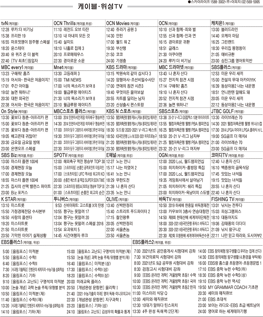 카카오톡 페이스북 트위터 전체 네이버밴드 네이버블로그 2월10일(수) 케이블·위성TV 편성표 박성희 기사 전체보기 영남일보(www.yeongnam.com), 무단전재 및 수집, 재배포금지 연예인기뉴스