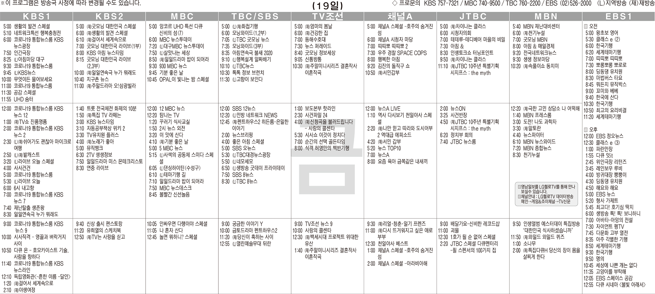 카카오톡 페이스북 트위터 전체 네이버밴드 네이버블로그 2월19일(금) TV 편성표 박성희 기사 전체보기 영남일보(www.yeongnam.com), 무단전재 및 수집, 재배포금지 연예인기뉴스