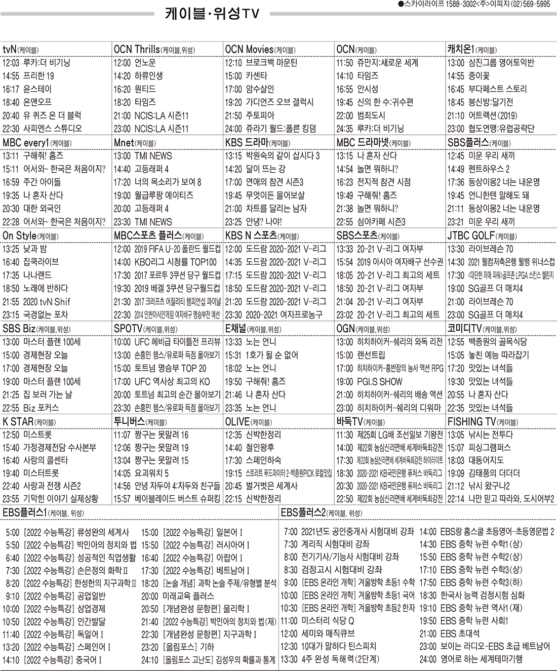 카카오톡 페이스북 트위터 전체 네이버밴드 네이버블로그 2월24일(수) 케이블·위성TV 편성표 박진관 기사 전체보기 영남일보(www.yeongnam.com), 무단전재 및 수집, 재배포금지 연예인기뉴스