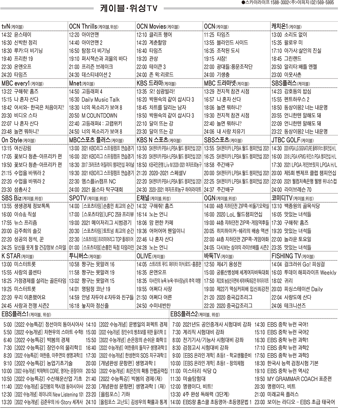 카카오톡 페이스북 트위터 전체 네이버밴드 네이버블로그 3월2일(화) 케이블·위성TV 편성표 박성희 기사 전체보기 영남일보(www.yeongnam.com), 무단전재 및 수집, 재배포금지 연예인기뉴스