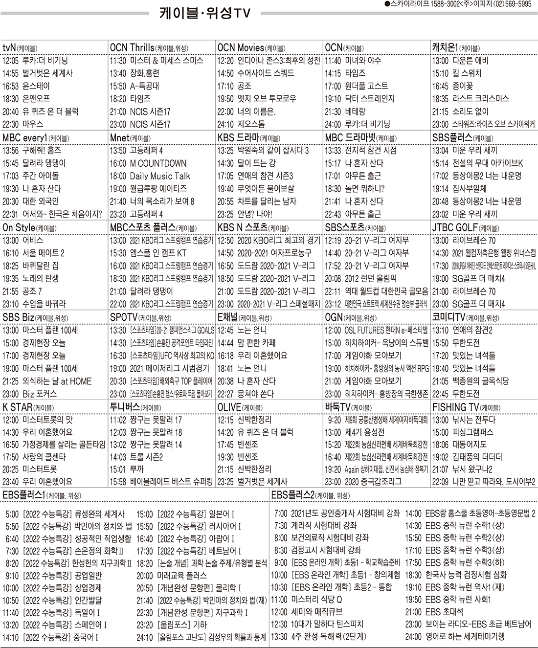 카카오톡 페이스북 트위터 전체 네이버밴드 네이버블로그 3월10일(수) 케이블·위성TV 편성표 박성희 기사 전체보기 영남일보(www.yeongnam.com), 무단전재 및 수집, 재배포금지 연예인기뉴스
