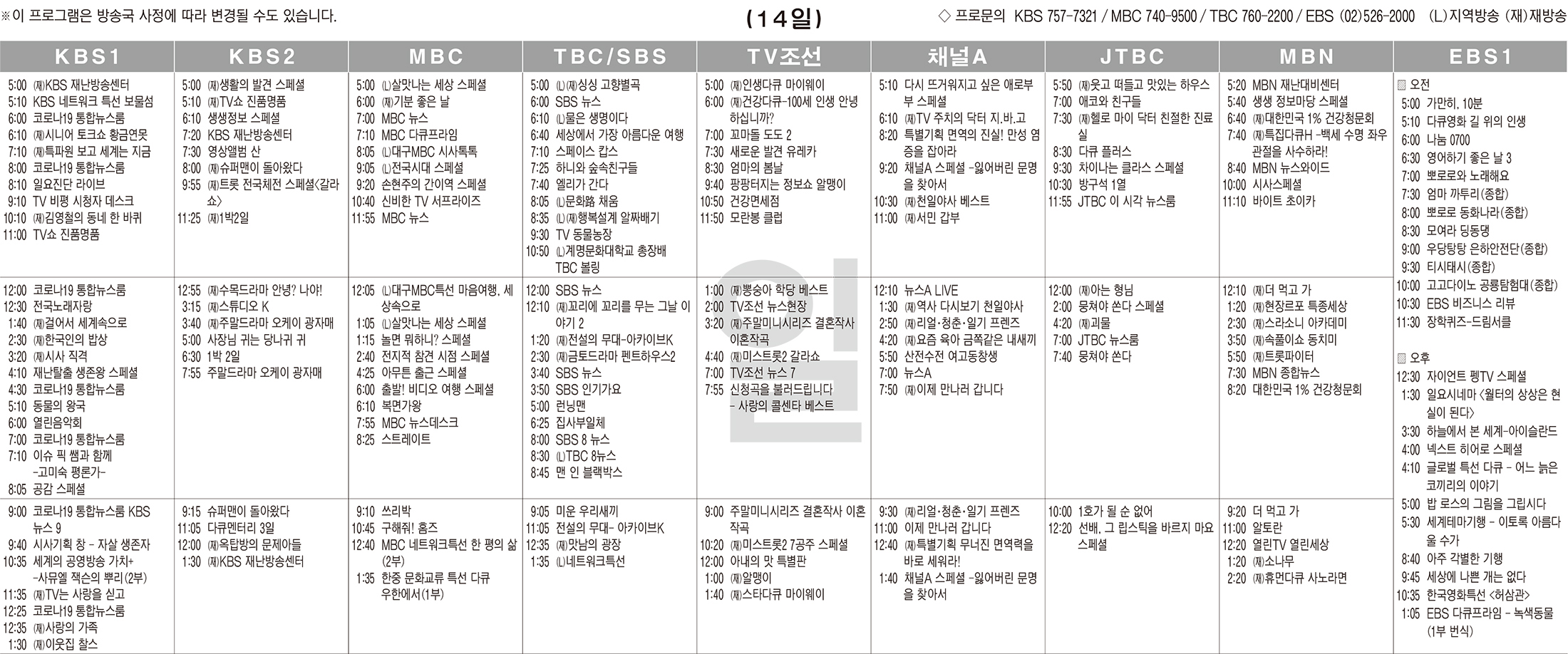 카카오톡 페이스북 트위터 전체 네이버밴드 네이버블로그 3월14일(일) TV 편성표 박성희 기사 전체보기 영남일보(www.yeongnam.com), 무단전재 및 수집, 재배포금지 연예인기뉴스