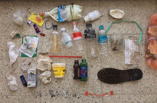 취재진이 수거한 쓰레기를 종량제 봉투에 넣어 버렸다. 흙 등 이물질이 묻은 플라스틱이나 비닐은 분리수거해도 재활용이 되지 않기 때문이다.