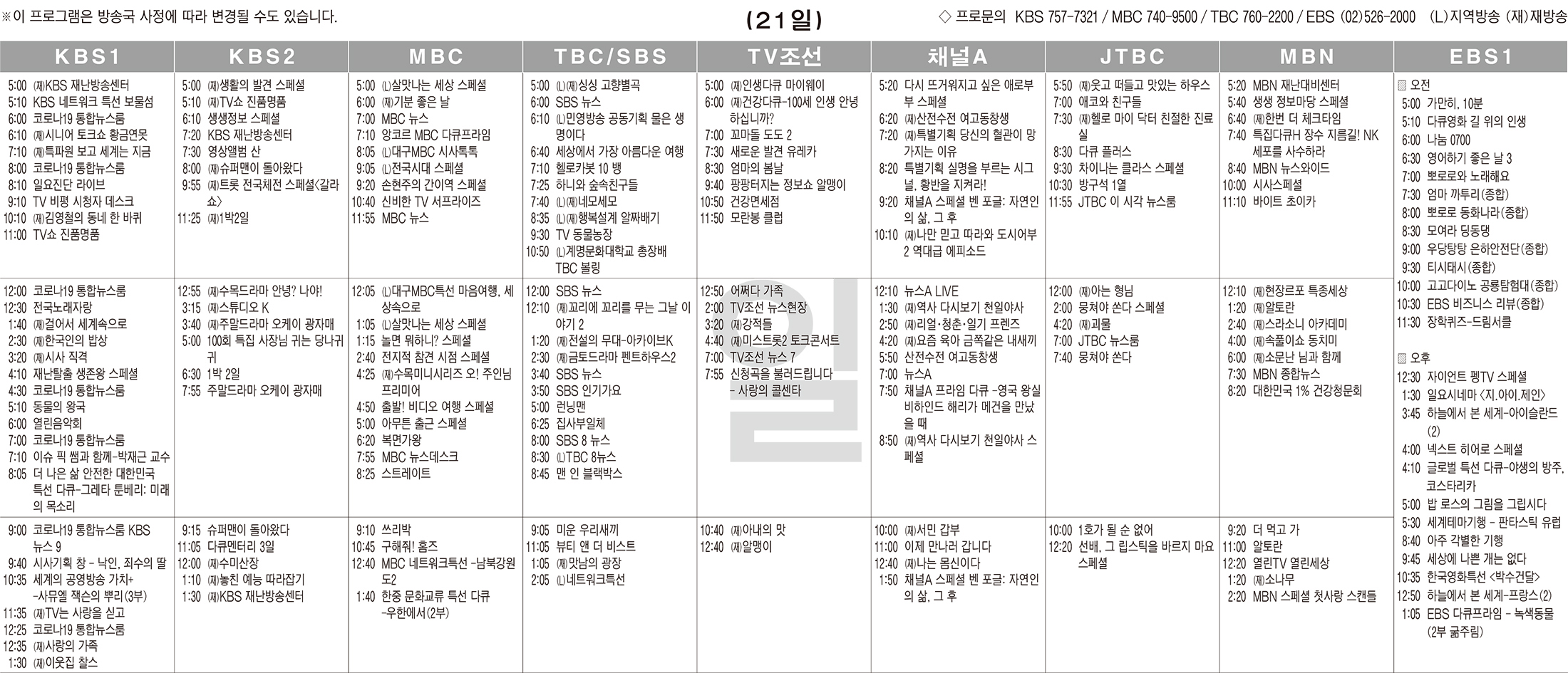 카카오톡 페이스북 트위터 전체 네이버밴드 네이버블로그 3월21일(일) TV 편성표 박성희 기사 전체보기 영남일보(www.yeongnam.com), 무단전재 및 수집, 재배포금지 연예인기뉴스