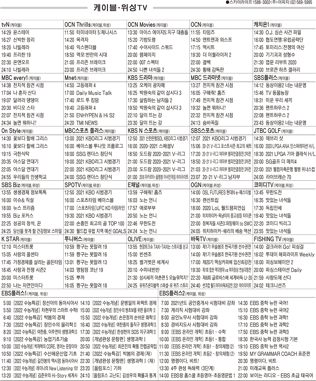 카카오톡 페이스북 트위터 전체 네이버밴드 네이버블로그 3월30일(화) 케이블·위성TV 편성표 박성희 기사 전체보기 영남일보(www.yeongnam.com), 무단전재 및 수집, 재배포금지 연예인기뉴스